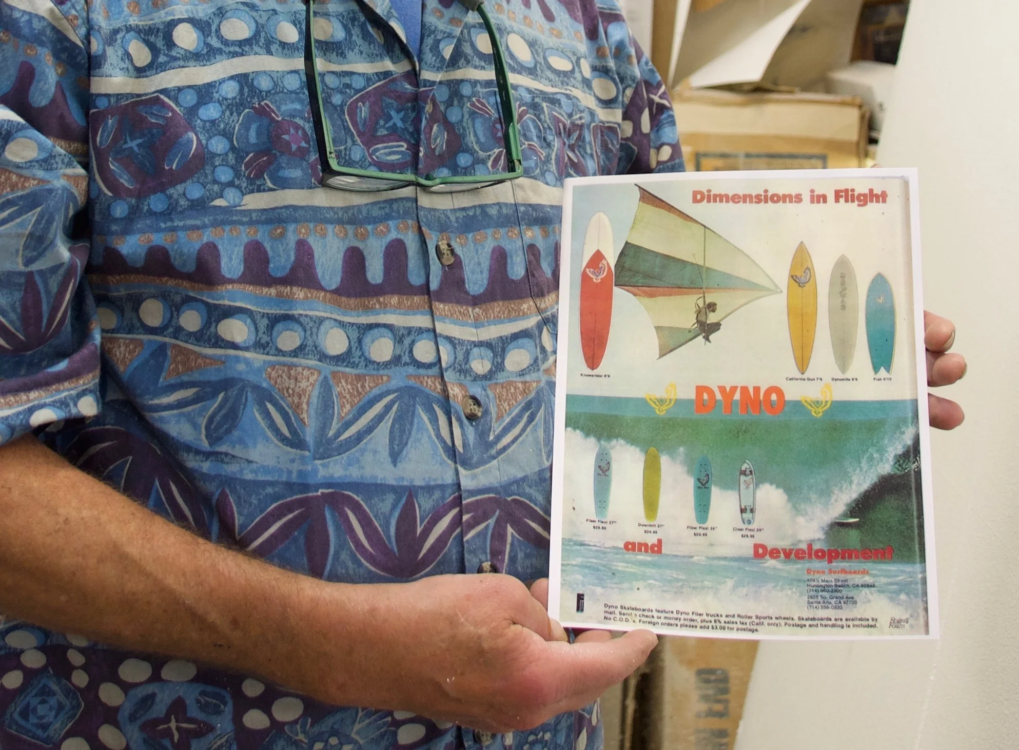Steve holding the old Dyno ad that ran in Surfer Magazine. Photo: Katherline Ha'o
